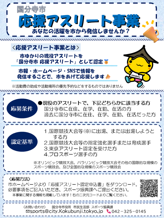 市にゆかりのある現役アスリートを「国分寺市応援アスリート」として認定し、その活動や活躍に関する情報を