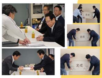 新庁舎にて新庁舎竣工書類等引渡し式を行ない、市長が出席しました。竹中・石本・セット設計特定建設共同企業体の皆さんを始めとし、工事に携わっていただいた関係者の皆さんに御尽力をいただき、無事新庁舎が完成いたしました。設計は令和3年4月から取り組み、工期としては令和4年12月から令和6年9月までの22か月という期間、事業を進めていただきました。