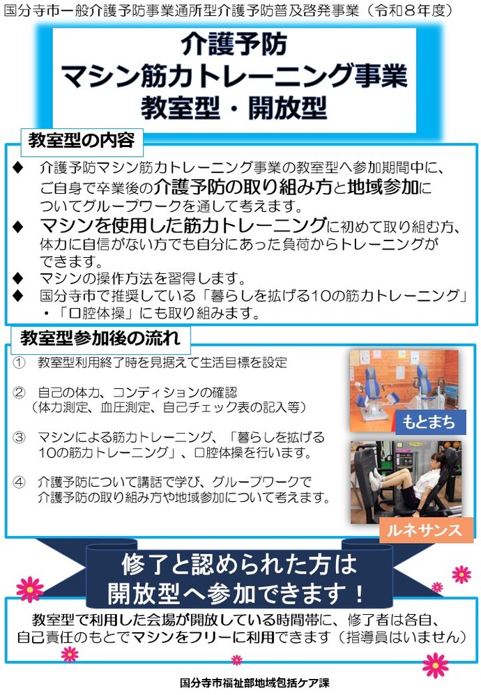 高齢者向け運動機器を使った身体作りや介護予防に関する講話にて、積極的に介護予防を実践しましょう。また、卒業後の自立した介護予防の取り組みかたもグループワークを通して考えてみませんか。