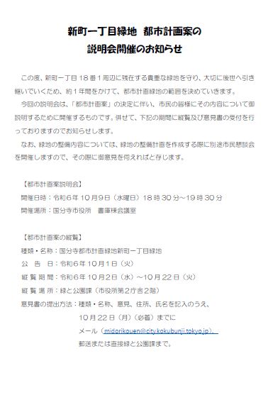 新町一丁目緑地都市計画原案の説明会の会議資料を掲示します。