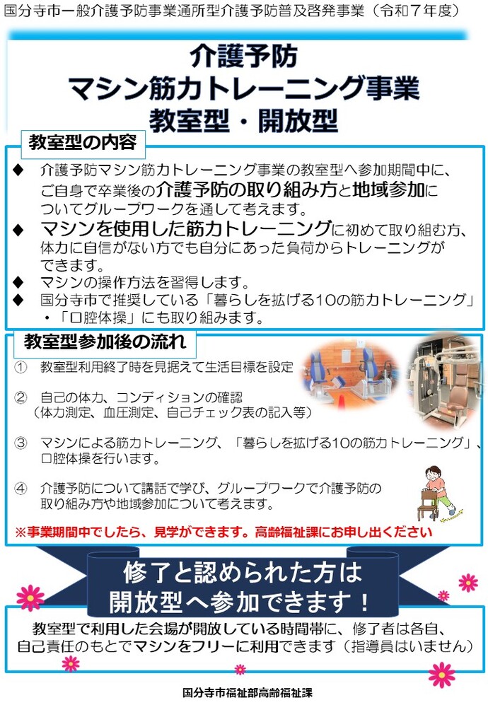 高齢者向け運動機器を使った身体作りや介護予防に関する講話にて、積極的に介護予防を実践しましょう。また、卒業後の自立した介護予防の取り組みかたもグループワークを通して考えてみませんか。